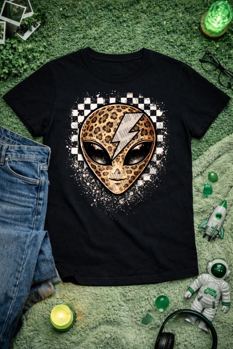 This alien + leopard print design blends cosmic chaos with fierce, wild energy—perfect for those who don’t fit in and never planned to.