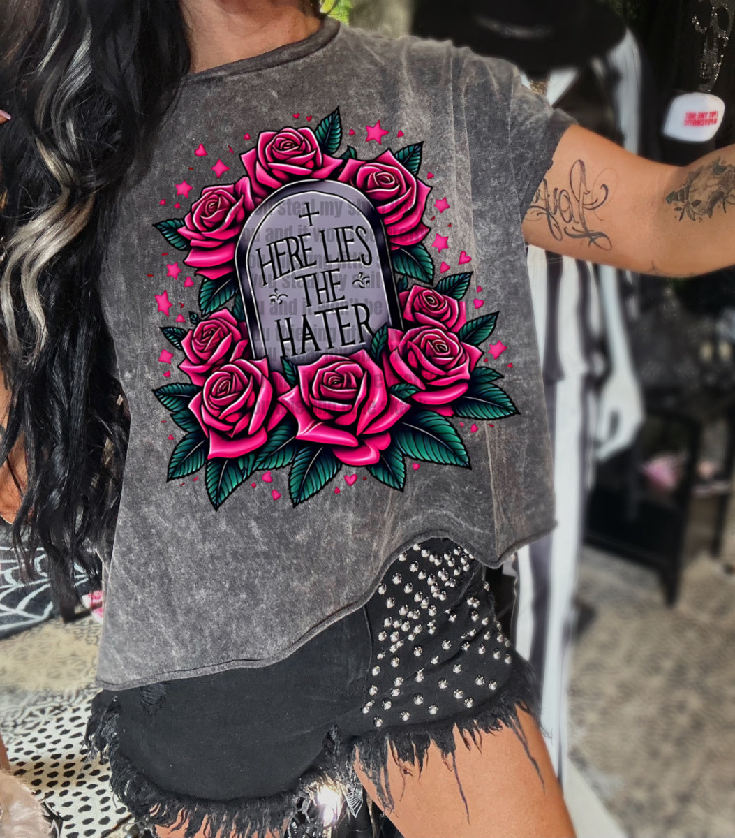 Grave fashion awaits with this shirt featuring a tombstone and rose design that reads 'Here Lies The Haters'. Put the negativity to rest with this quirky and humorous addition to your wardrobe.