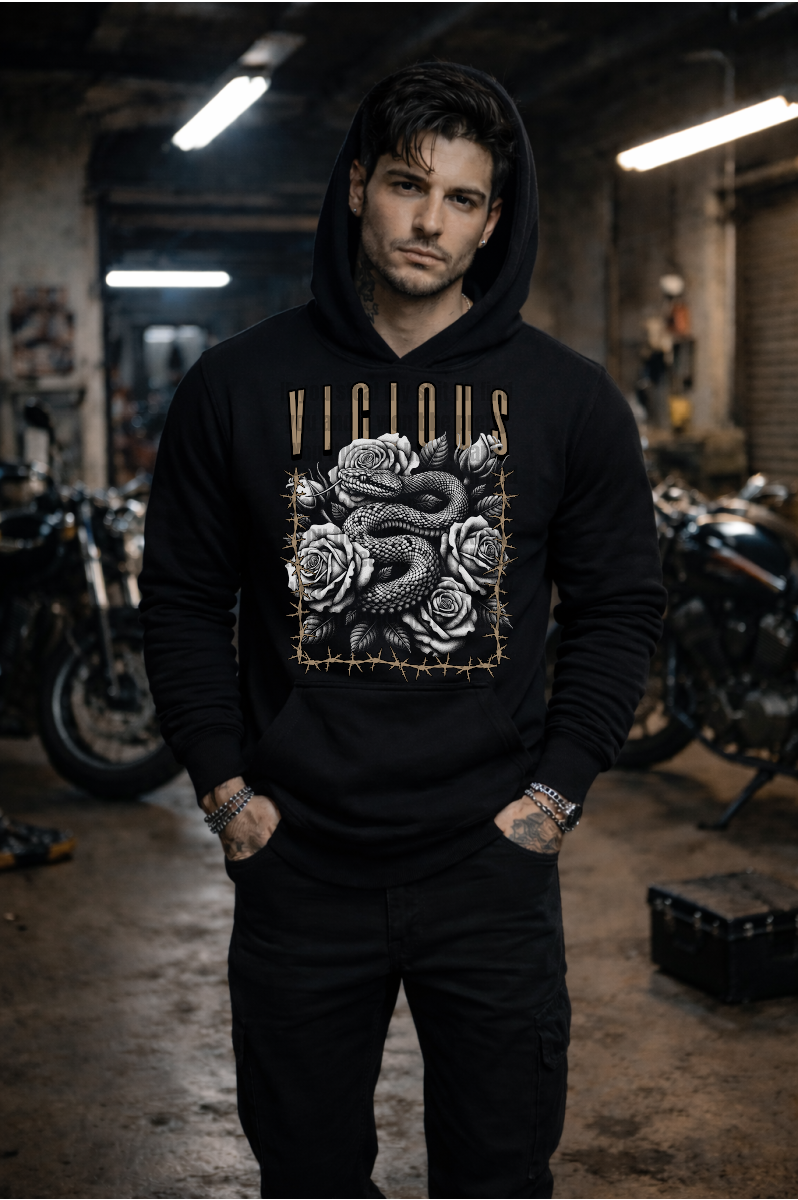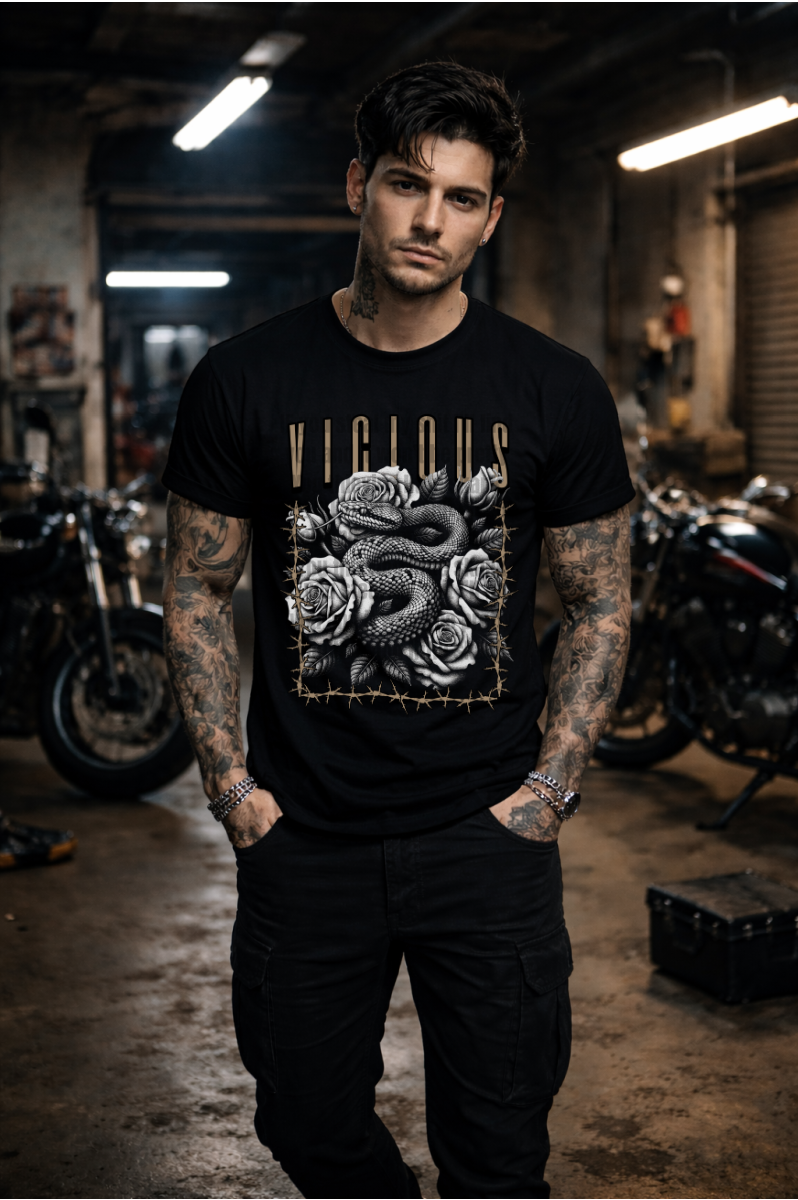 A striking design that captures raw edge and untamed style. This men's tee features a coiled snake intertwined with a rose, all wrapped in menacing barbed wire—a bold statement piece for those who embrace their darker side. The playful contrast between beauty and danger makes this design unforgettable. Perfect for guys who want their wardrobe to reflect their fearless attitude and rebellious spirit.