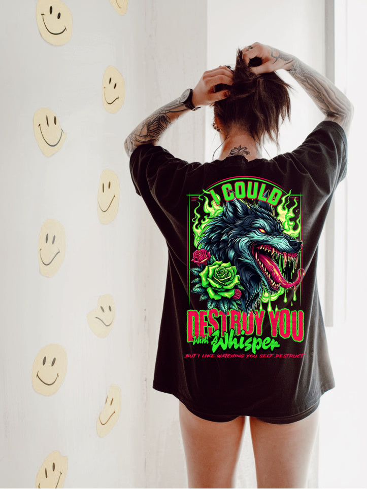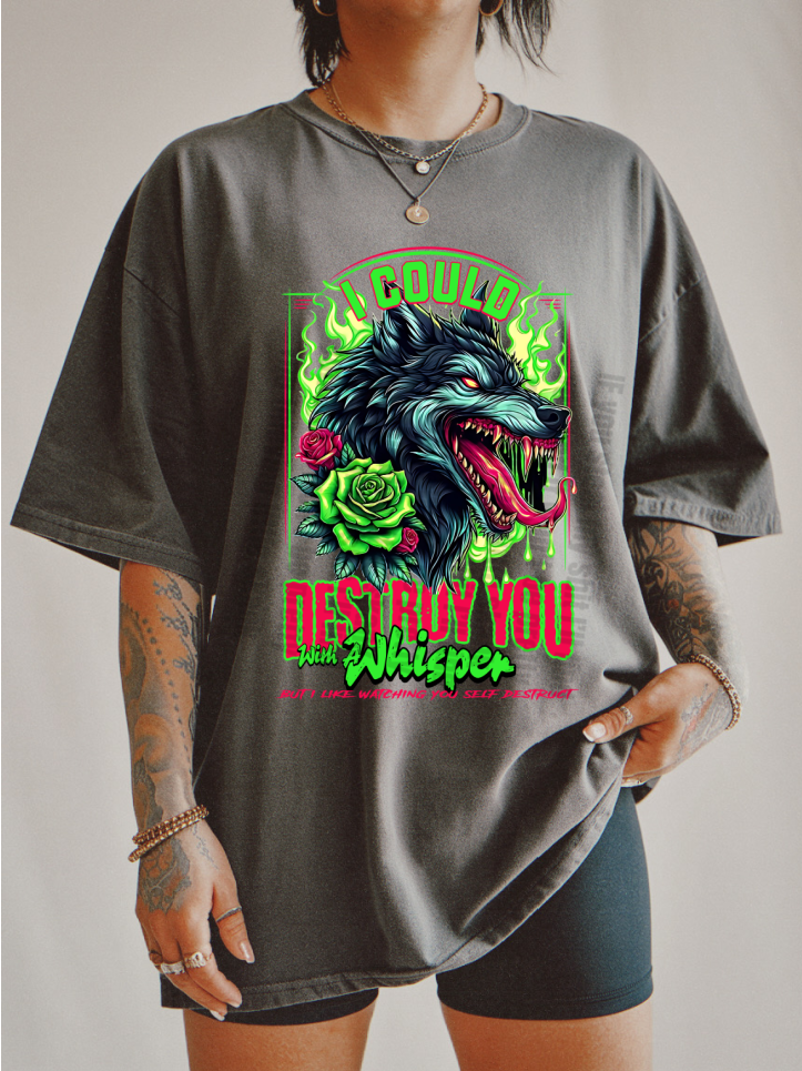 Featuring an angry wolf and rose design, this shirt conveys power and subtle flirtation. You may be able to destroy someone with a whisper, but why not just watch them self destruct?